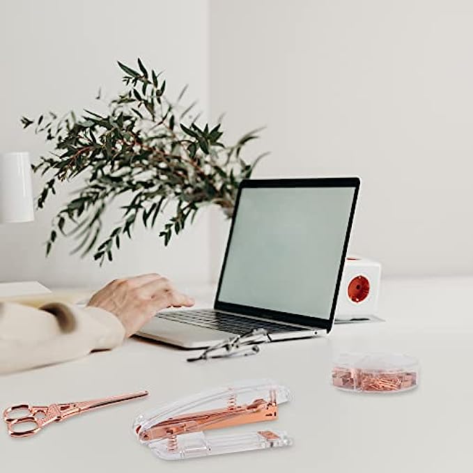 ?ROSE GOLD DESK ACCESSORIES INCLUDES -- 1* Stapler , 1* Tape Dispenser, 1* Rose Gold Scissors, 1* Mini Stapler Removers, 7* 0.75" Binder Clips, 15* 0.59" Binder Clips, 30* Paper Clips, 20* Push Pins and 1000* Staples